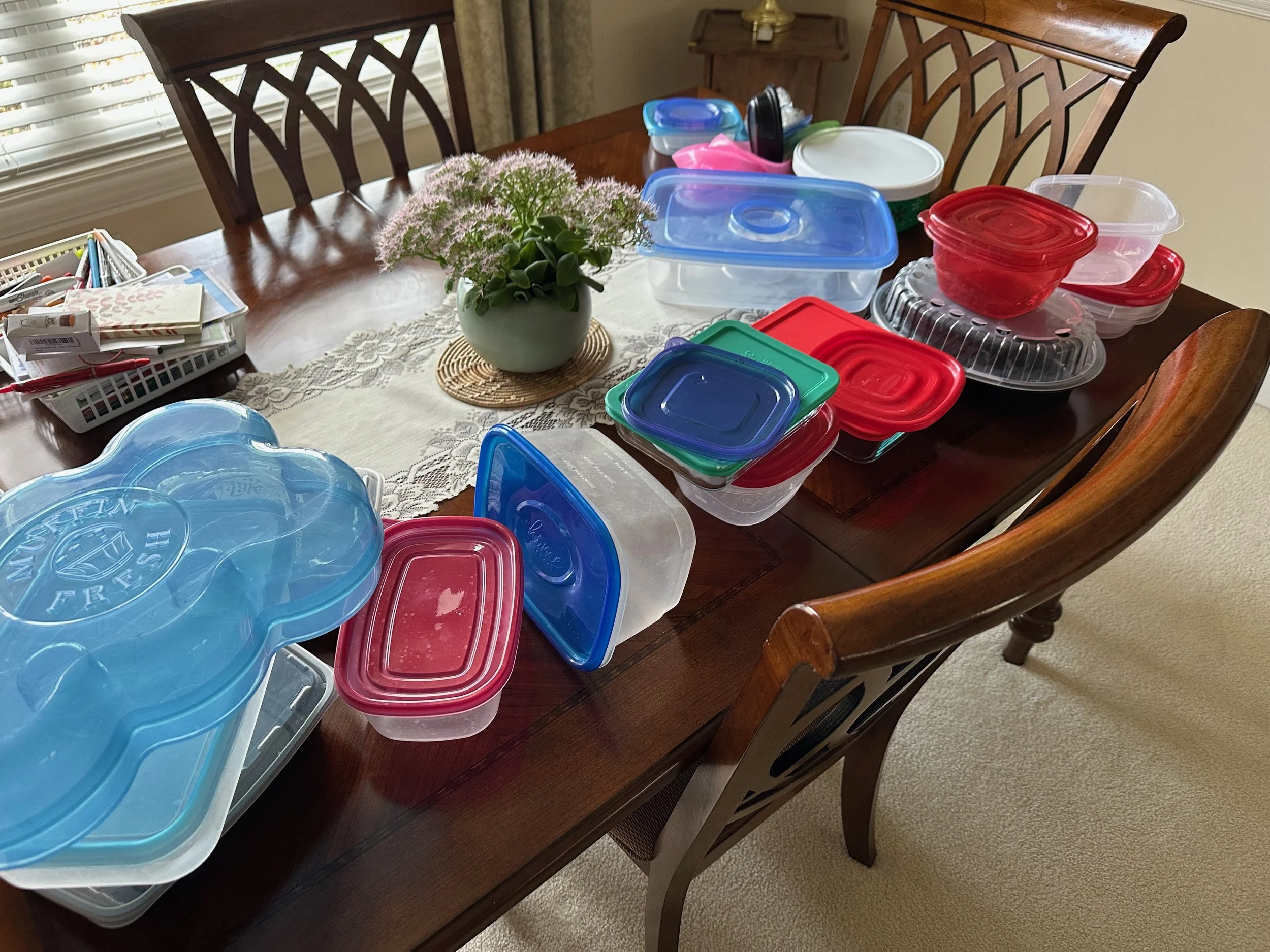 We assembled a parade of plastic on the dining room table. We got rid of any bowl without a lid as well several others.