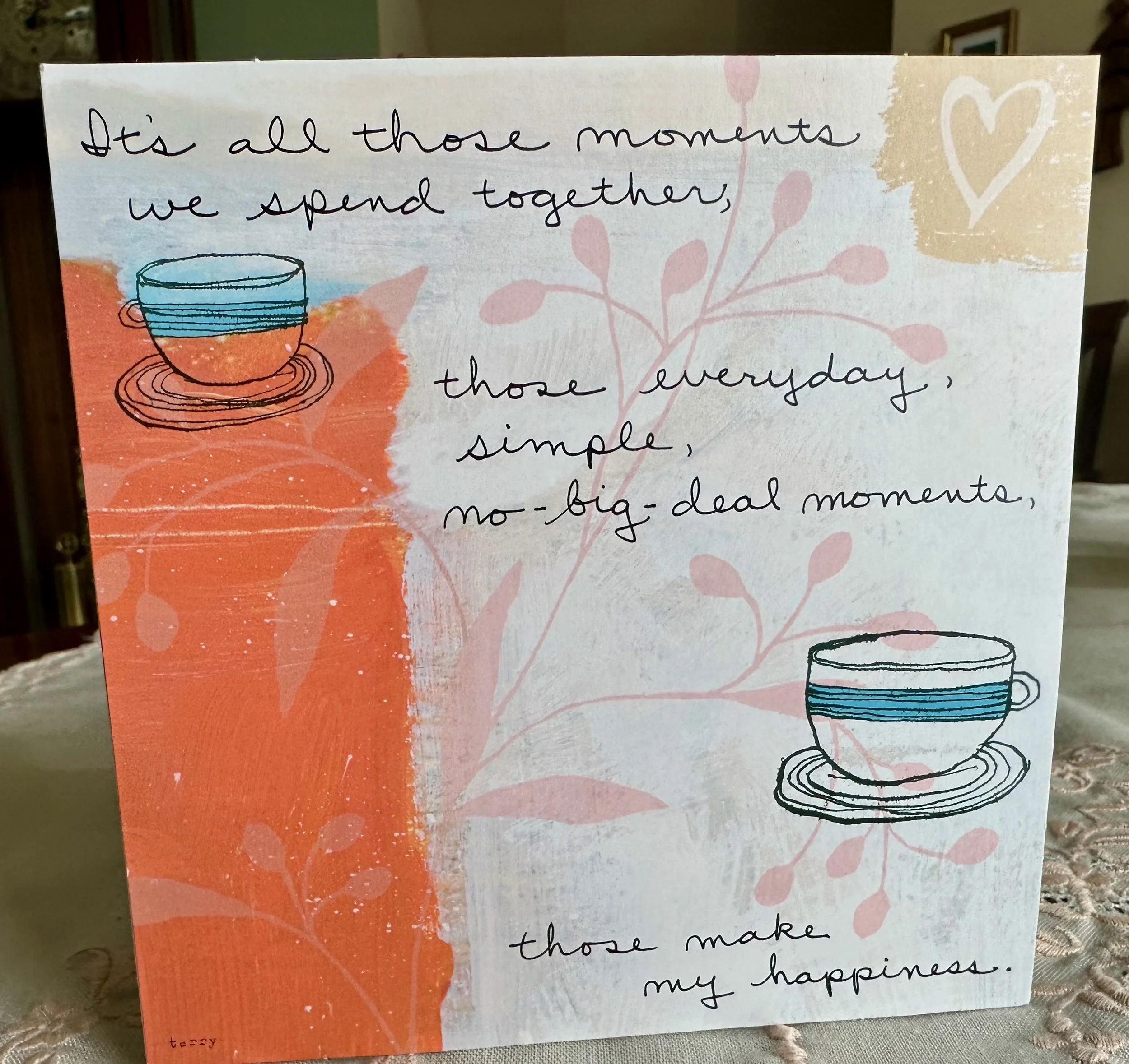 I doubt she had the flu in mind when she wrote. But it brings me special joy—and grief—to be reminded that she felt that way about the rhythm of our daily lives. Thank you, God, for whatever carelessness or providence prompted me to keep a card that now, no matter what else, I will never throw away.